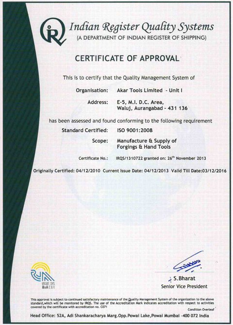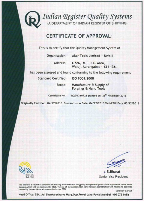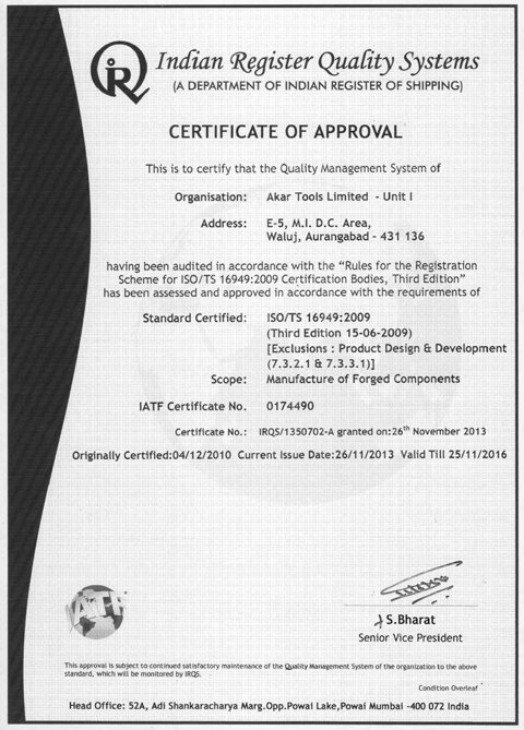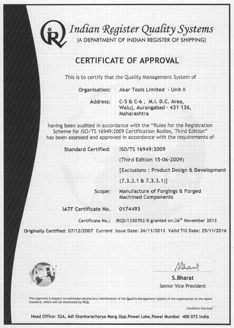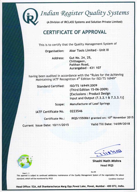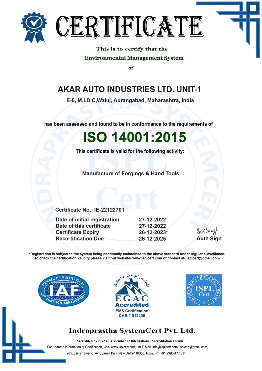 Akar Auto Industries Ltd, an ISO/TS 16949:2009 certified company is the forward integrated enterprises of R.L. Group of Industries. Situated in Waluj near Aurangabad, Maharashtra, which is one of the major automotive clusters in India with good transport connectivity. Akar Auto Industries Ltd was established in 1989. Since, Start of production in 1991, Akar Auto Industries Ltd manufacturer's hi- quality precision engineered forging components, Hand Tools and Leaf Springs to major Auto & Non-Auto OEM's.